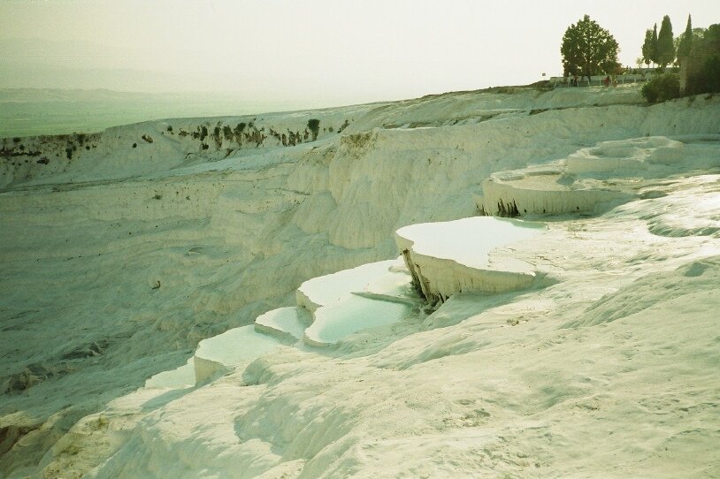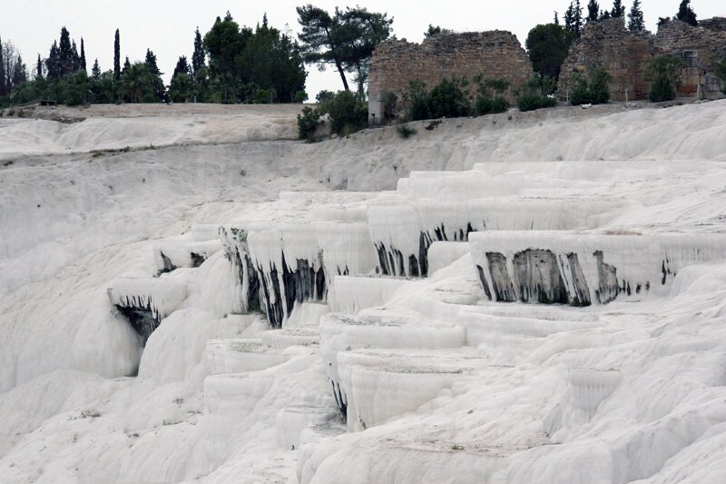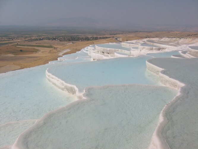 Памуккале в переводе с турецкого, означает "хлопковая крепость". Это одна из самых популярных достопримечательностей Турции. Эти термальные источники образовались миллионы лет назад в результате естественных химических процессов, связанных с отложением солей в горных породах, вследствие выброса горячими подземными источниками большого количества кальция. Соляные террасы Памуккале представляют собой широкие ступени, поражающие своей естественной огранкой и конфигурацией.