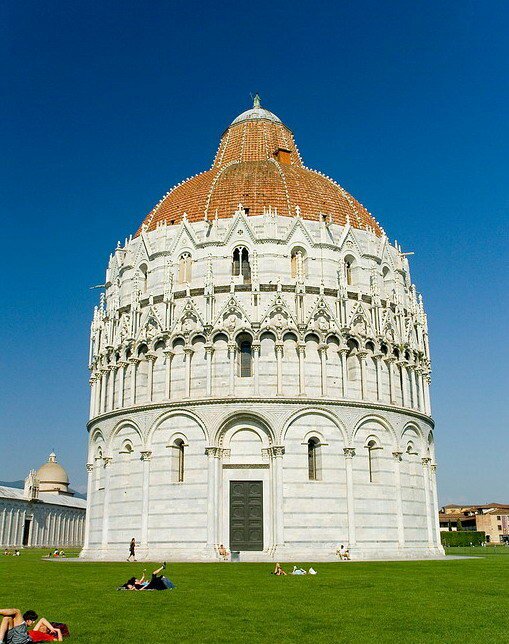 Баптистерий представляет собой здание круглой формы в романском стиле, декорированное аркадами и лоджиями. Оно увенчано замечательным куполом пирамидальной формы. Работы по его сооружению начались в 1153 году. Диаметр помещения составляет 35 с половиной метров. Здесь находится кафедра Никола Пизано, статуи его работы и великолепная купель в виде восьмигранника, инкрустированная разноцветным мрамором.