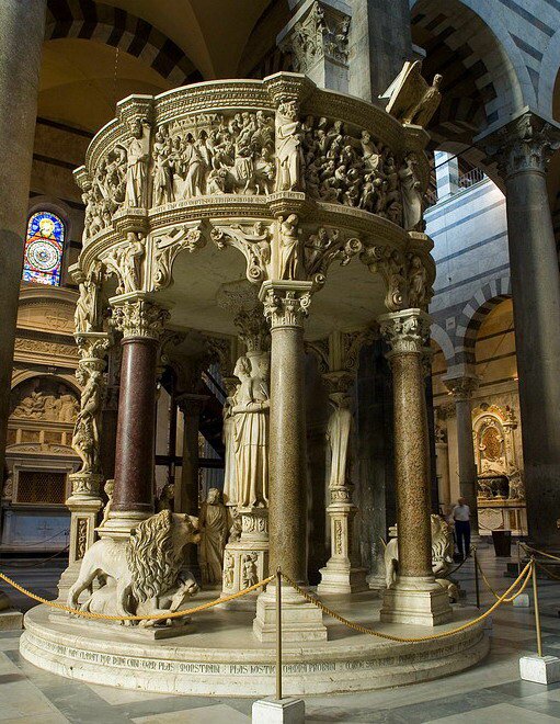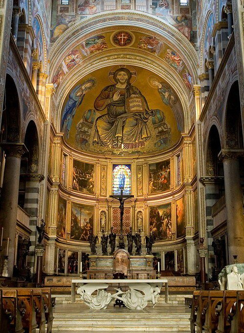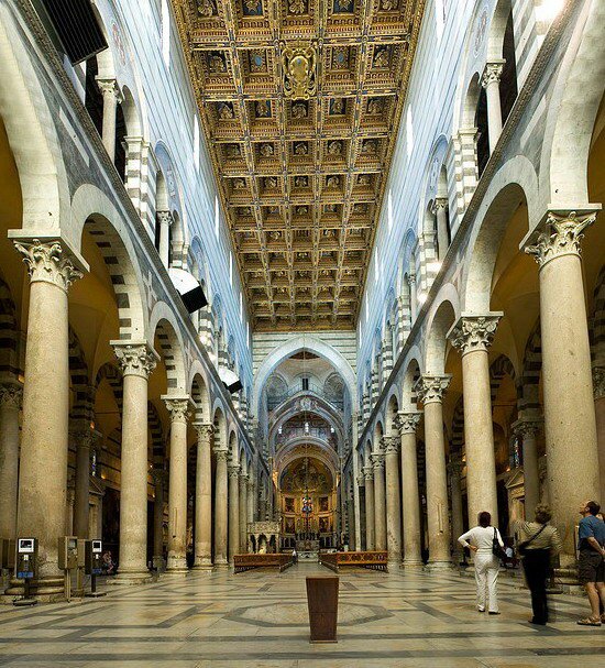 Собор – это памятник архитектуры, в котором наиболее полно воплощены романо-пизанского стиля. Его постройка была начата в 1064 году архитектором Бускето. Его последователь – Райнальдо, расширил здание и создал замечательный фасад, состоящий из четырёх ярусов галерей. Ему же принадлежат три бронзовых портала, изобилующие разноцветными скульптурными украшениями.